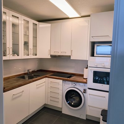 Keuken: oven, microgolfoven, vitrokeramische kookplaat, wasmachine, vaatwasmachine, koelkast en diepvries met elk vier laden. Koffiezet en Senseoapparaat, waterkoker, ruim assortiment potten en pannen, keukengerei, porselein en glas.